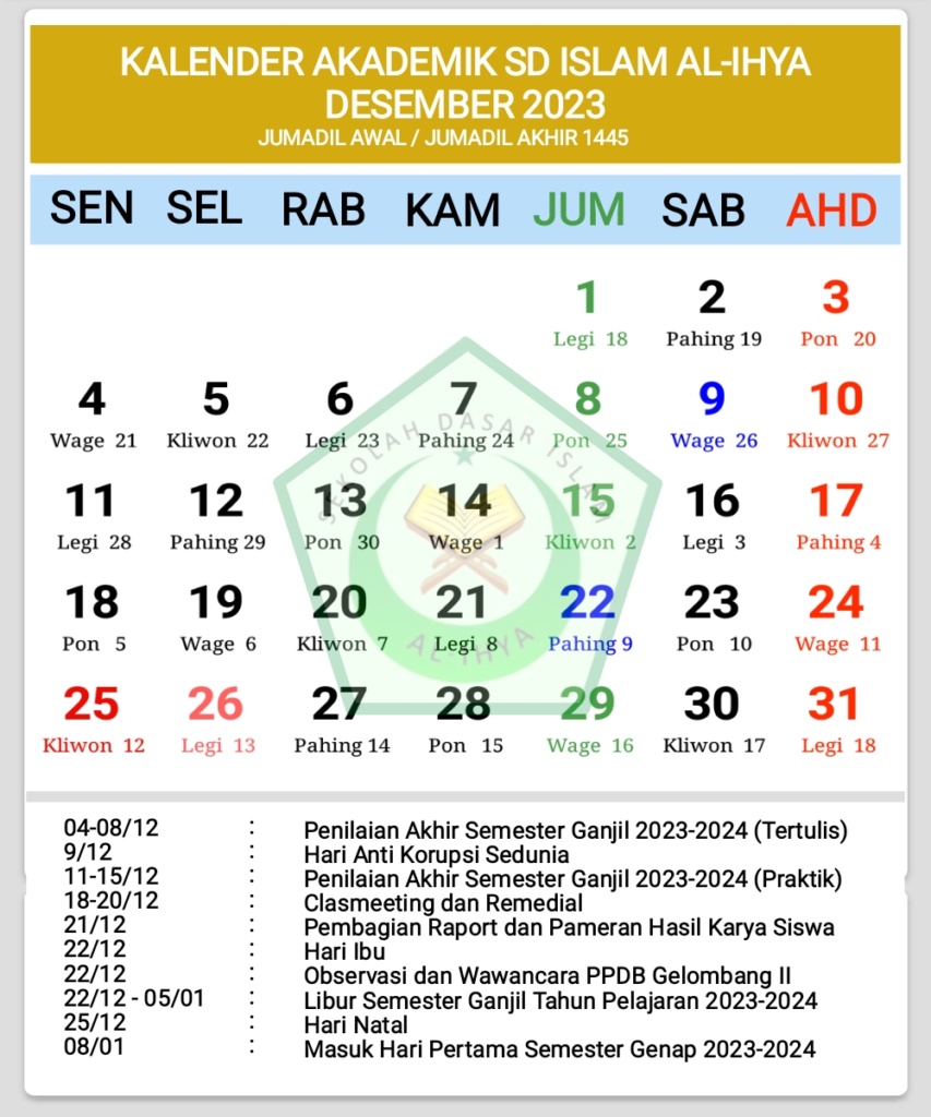 Berikut adalah kalender Pendidikan menuju Akhir Semester Genap SD Islam Al-Ihya Rangkapan Jaya Baru Depok. Dalam kalender tersebut juga tercantum untuk jadwal pelaksanaan Observasi dan wawancara PPDB SD Islam Al-Ihya Gelombang II Tahun Pelajaran 2024/2025